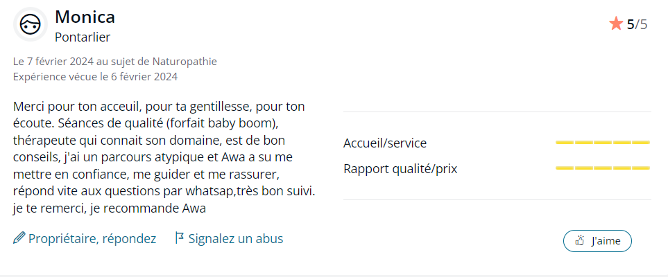 Clarissa M depuis google 5/5 "Awa est une naturopathe passionnée et experte dans sa spécialité. Elle ne ménage pas son énergie dans les conseils données. Elle saura vous apporter un soutien et des solutions dans votre parcours. C’est un rayon de soleil, souriante et qui adore son métier. Elle vous accompagnera jusqu'au bout. Ayant un parcours compliqué en PMA, je suis reconnaissante d'être tombée sur elle. C'est absolument ce qui me fallait. Merci" |